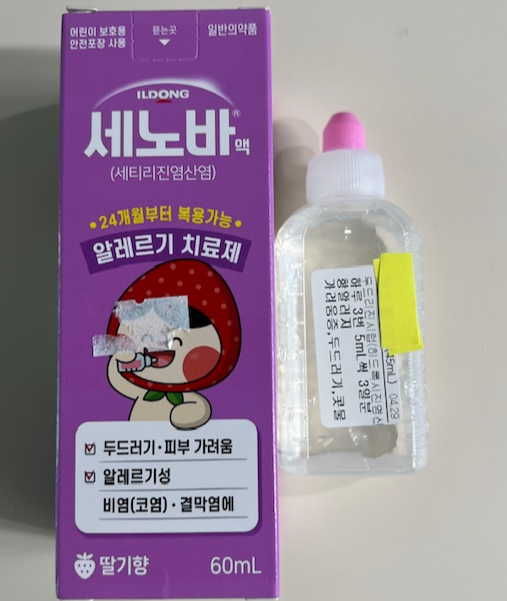 - 먹는 알러지약 (항히스타민제) - 세노바 액은 약국에서 구매, 두드리진시럽은 병원에서 처방 받았어요.